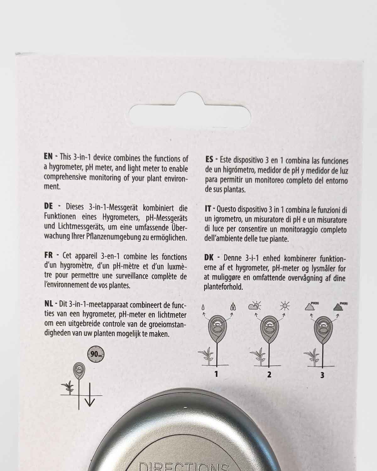 Ja sam 3u1 mjerač vlažnosti, svjetlosti i pH, neophodan alat za sve koji žele bolje razumjeti potrebe svojih biljaka. S jednim alatom provjeravaš vlažnost tla, količinu svjetlosti i kiselost supstrata.