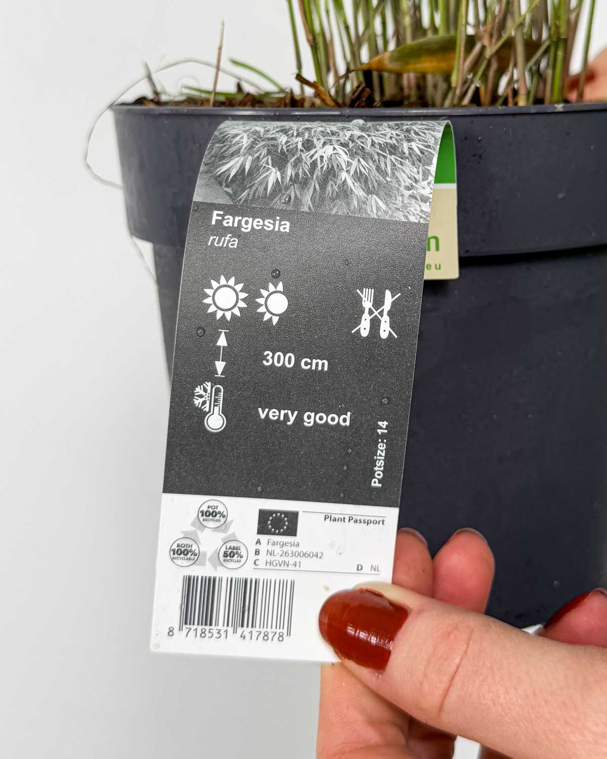 Ja sam Fargesia ‘Rufa’: velik, visok i gusto grmovit! Bez brige, polako se širim i rastem tako da imaš vremena pripremiti se za moje mlade biljke. 😉 Mladice su žarko crvene, kasnije postanem narančasto crvena do tamno zelene boje. Moji stariji listovi su cimet smeđe boje. Ukrasim se s puno elegantnih uskih listova, koji tvore lijepu veliku krošnju.