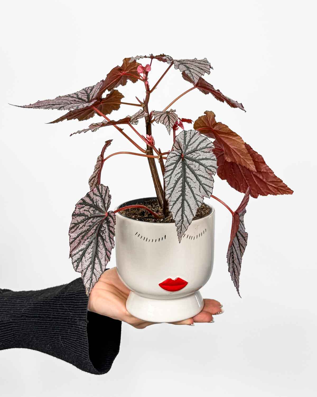 Ja sam Begonija ‘Ashura Wing‘ (Begonia), prava kraljica među sobnim biljkama. Imam prekrasne metalno-ružičaste listove s tamno zelenim žilama, s kojima svakome oduzimam dah. Mogu narasti do 60 cm u visinu i 40 cm u širinu, a kad budem rasla, bit ću sretna s štapom za potporu. Ako budem imala dovoljno svjetla, razveselit ću te prekrasnim ružičastim cvjetovima. Ali iskreno, s ovim prekrasnim listovima je sasvim svejedno, cvjetam li ili ne ;).