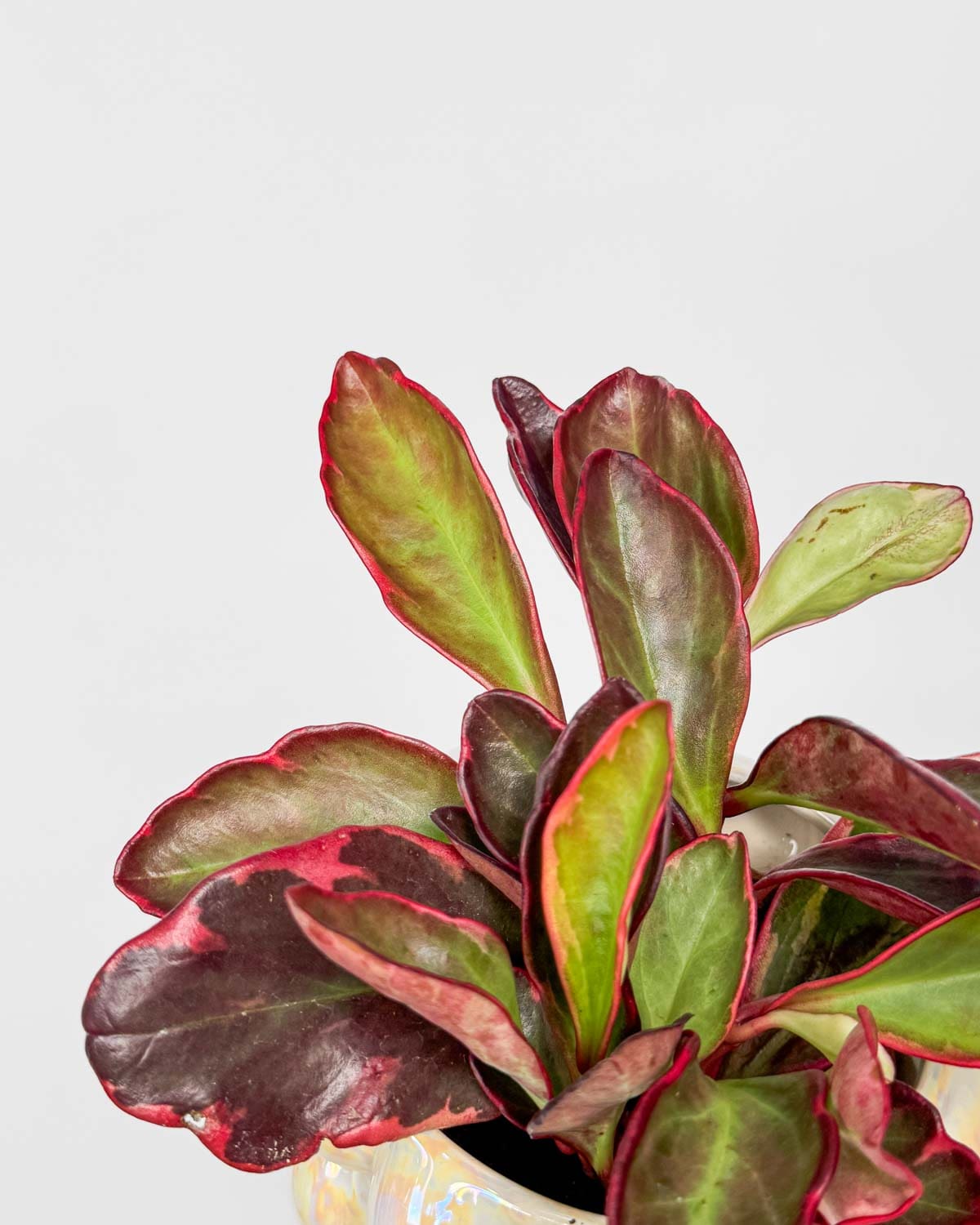 Ja sam Peperomija ‘Jellie’ (Peperomia clusiifolia), prekrasno šarena i nezahtjevna peperomija. Imam mesnate, ovalne listove, na kojima se isprepliće kombinacija zelene, kremne i crvene boje na rubovima. Ako sam izložena direktnom suncu, mogu se obojiti i potpuno crveno i izgledati još posebnije. Nisko rastem i dobro podnosim redovito oblikovanje, tako da na tvoju želju mogu ostati mala i kompaktna.