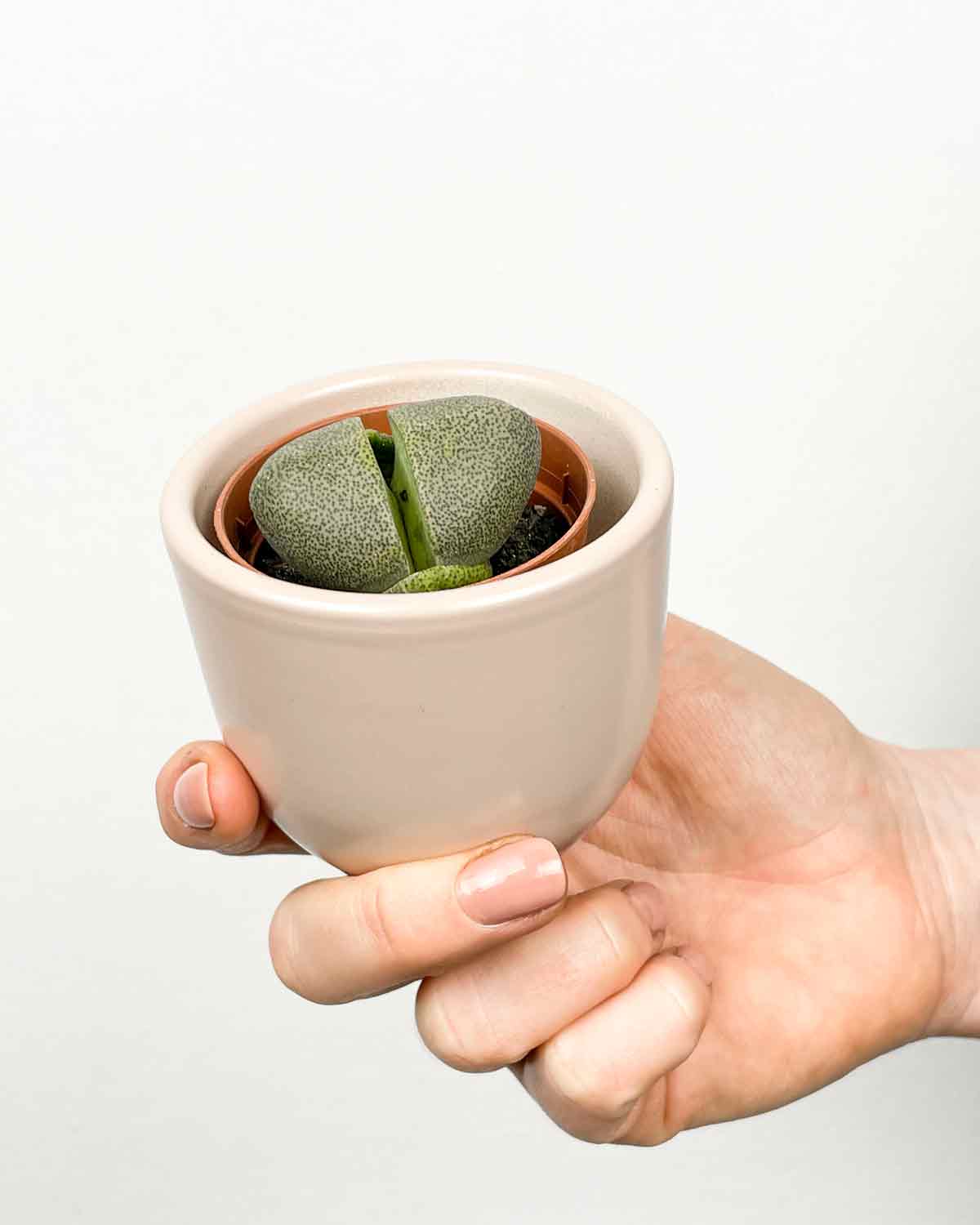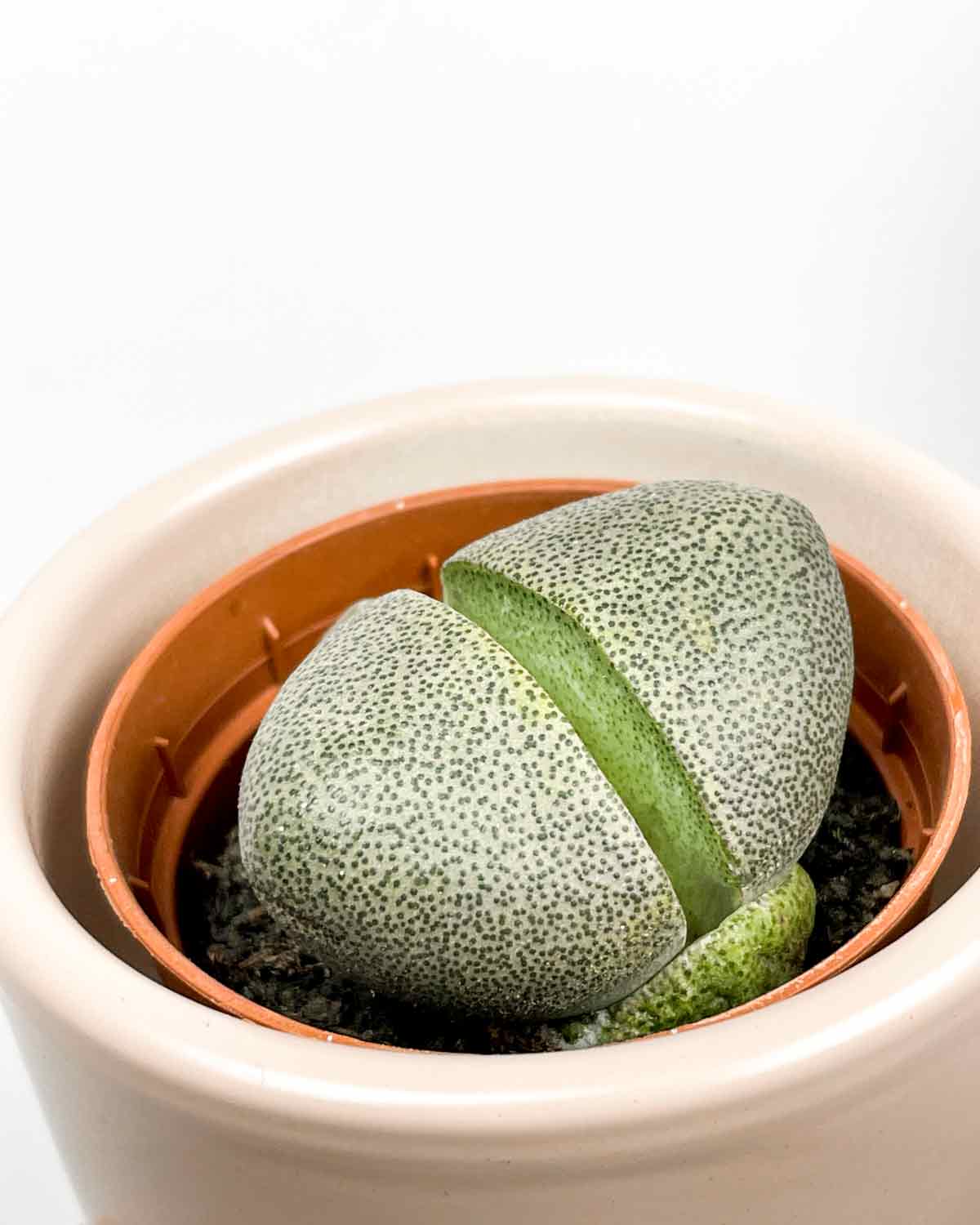 Evo i mene i mog posebnog izgleda, koji podsjeća na kamen. Spadam u sukulente i dolazim iz Južne Afrike, a za rast mi ne treba puno vode, ali mi treba puno svjetlosti koja mi pomaže u tome da te iznenadim s narančastim cvjetovima 🙂