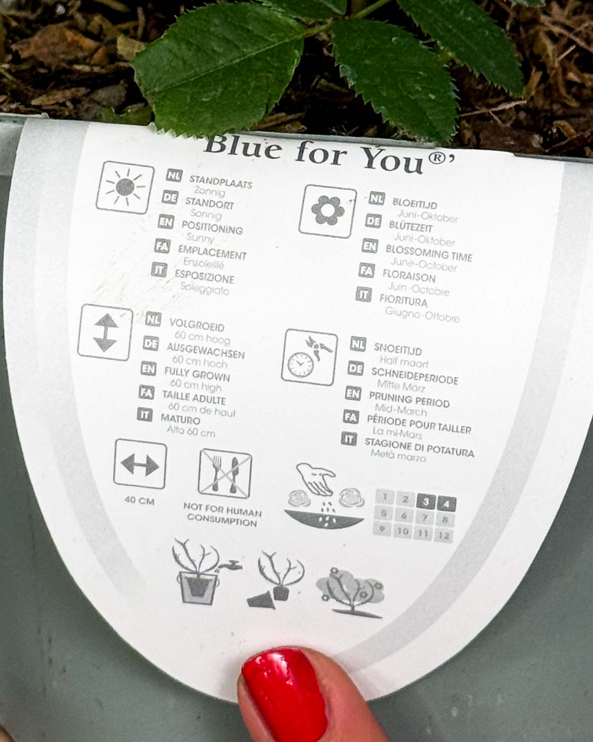 Ja sam floribunda ruža ‘Blue For You’ (Rosa), grmolika ruža koja oduševljava svojim prekrasnim plavo-ljubičastim cvjetovima. Zovu me i mnogocvjetnica, jer cvjetam tijekom cijelog ljeta. Mogu narasti do 1,2 metra u visinu i 80 cm u širinu, konačnu veličinu postižem za otprilike 2-3 godine.
