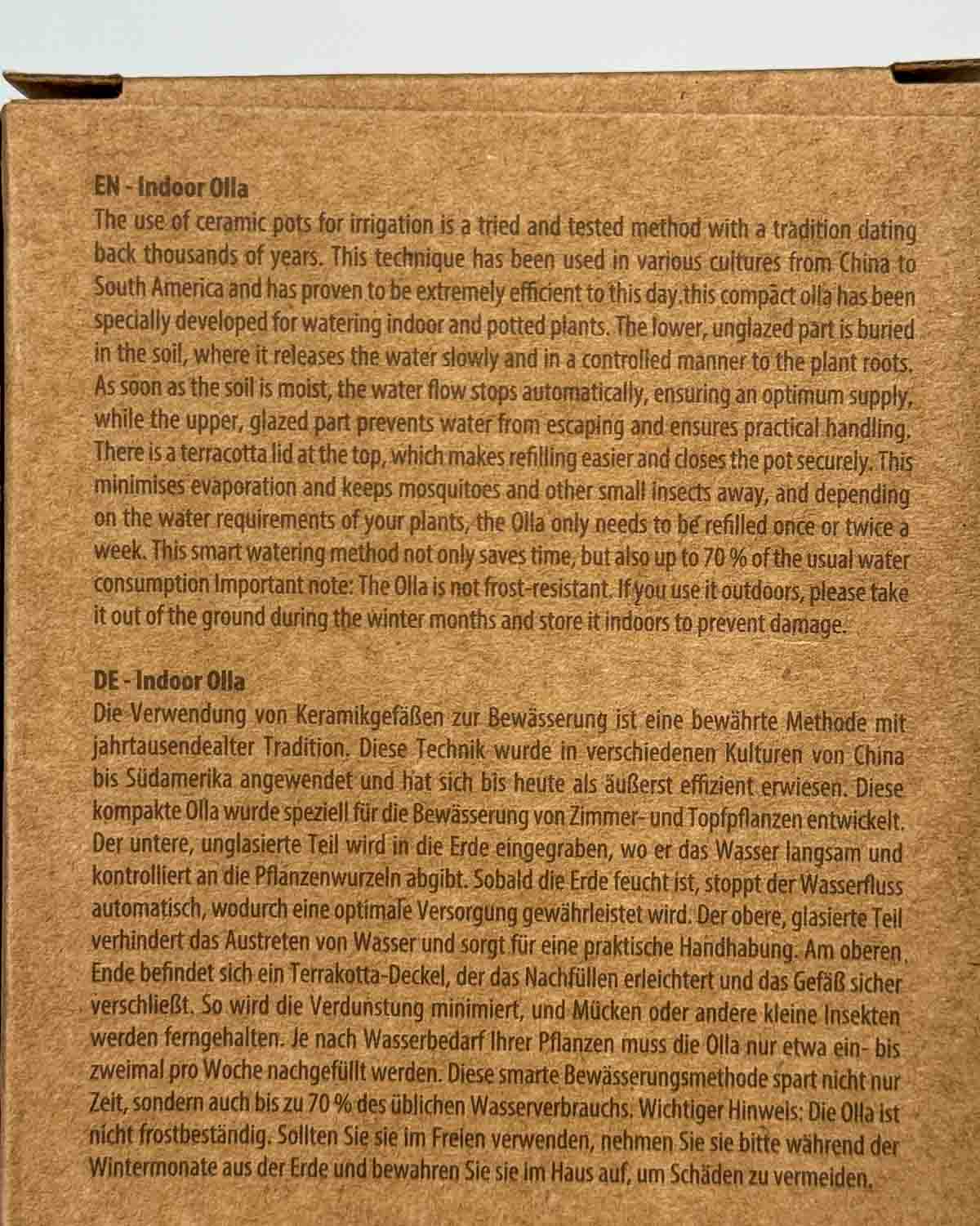 Ovaj način zalijevanja pomaže spriječiti najčešći problem u njezi biljaka: prekomjerno ili premalo zalijevanje. Posudu jednostavno napuniš vodom i zatvoriš je poklopcem koji smanjuje isparavanje. Olla zatim automatski brine za ravnomjerno vlaženje zemlje.