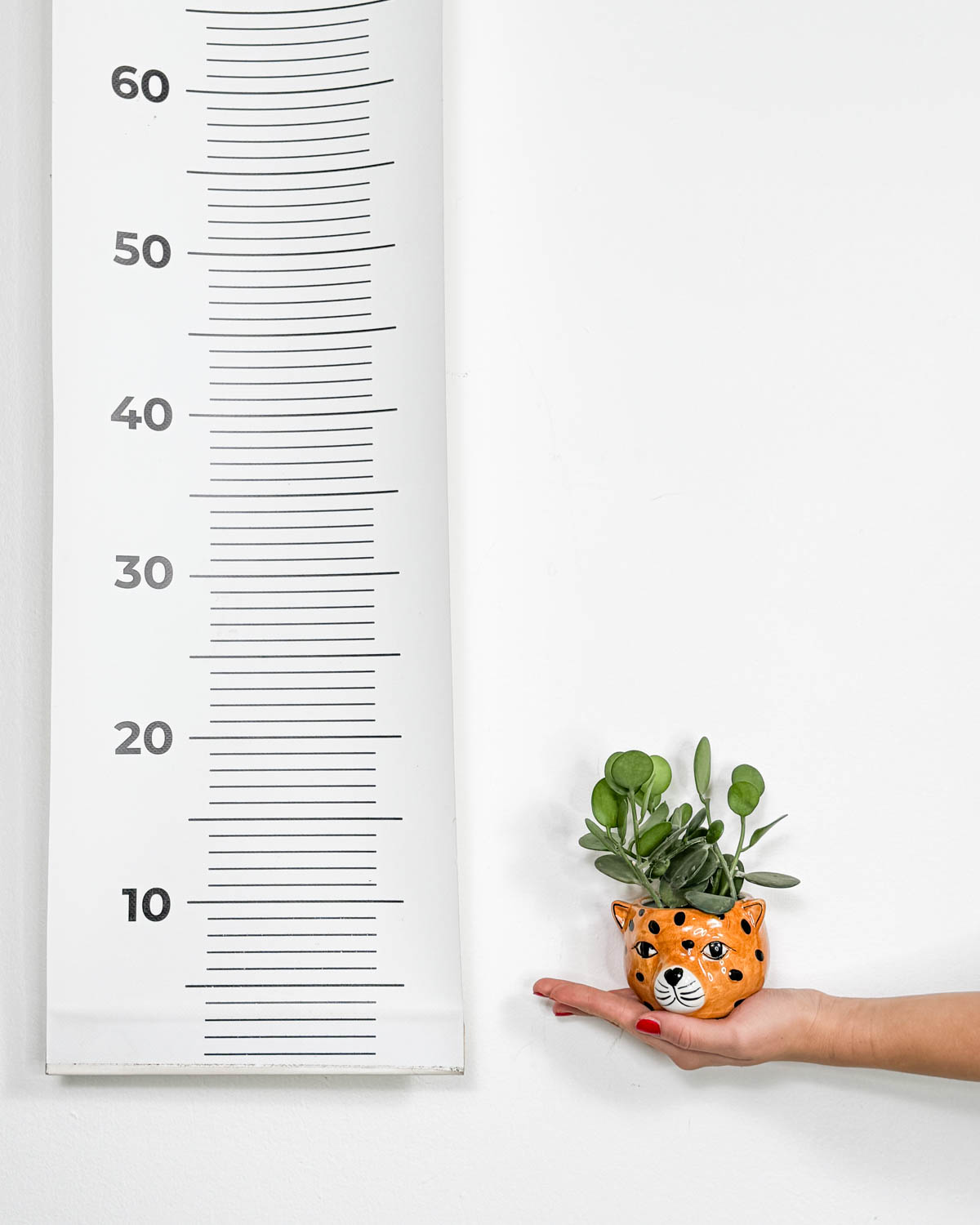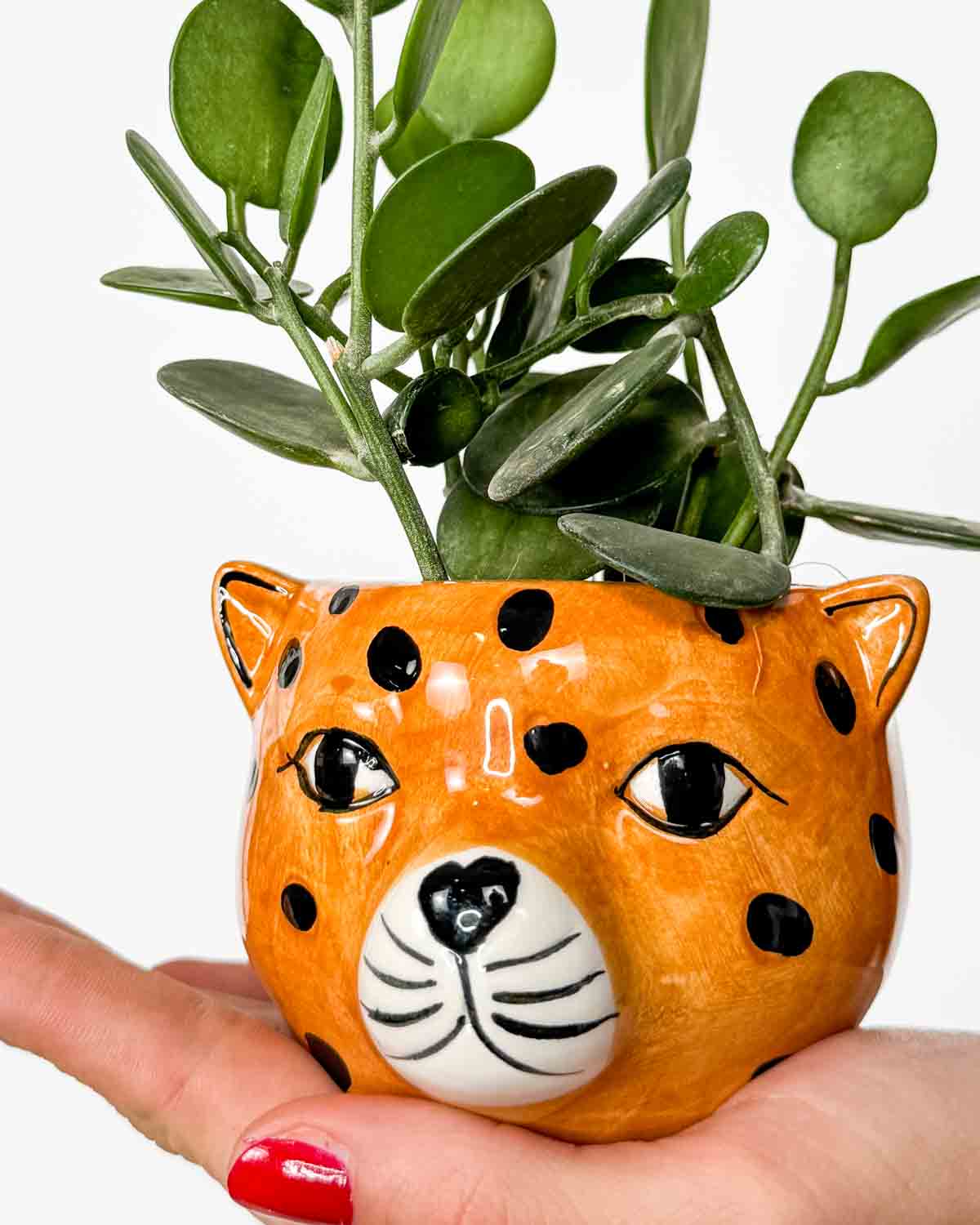 Svi vole simpatične okrugle listove, a ja, Silver Dollar Vine (Xerosicyos danguyi) imam upravo takve…i to u srebrno-zelenoj boji! Vrlo sam jednostavna biljka koja raste prema dolje i u sobnim uvjetima može doseći duljinu do 1 metra. Osim što sam super izbor za početnike, također sam netoksična za ljude i životinje. 🙂 U ovoj verziji, dobivate me i s ukrasnom posudom u obliku geparda!