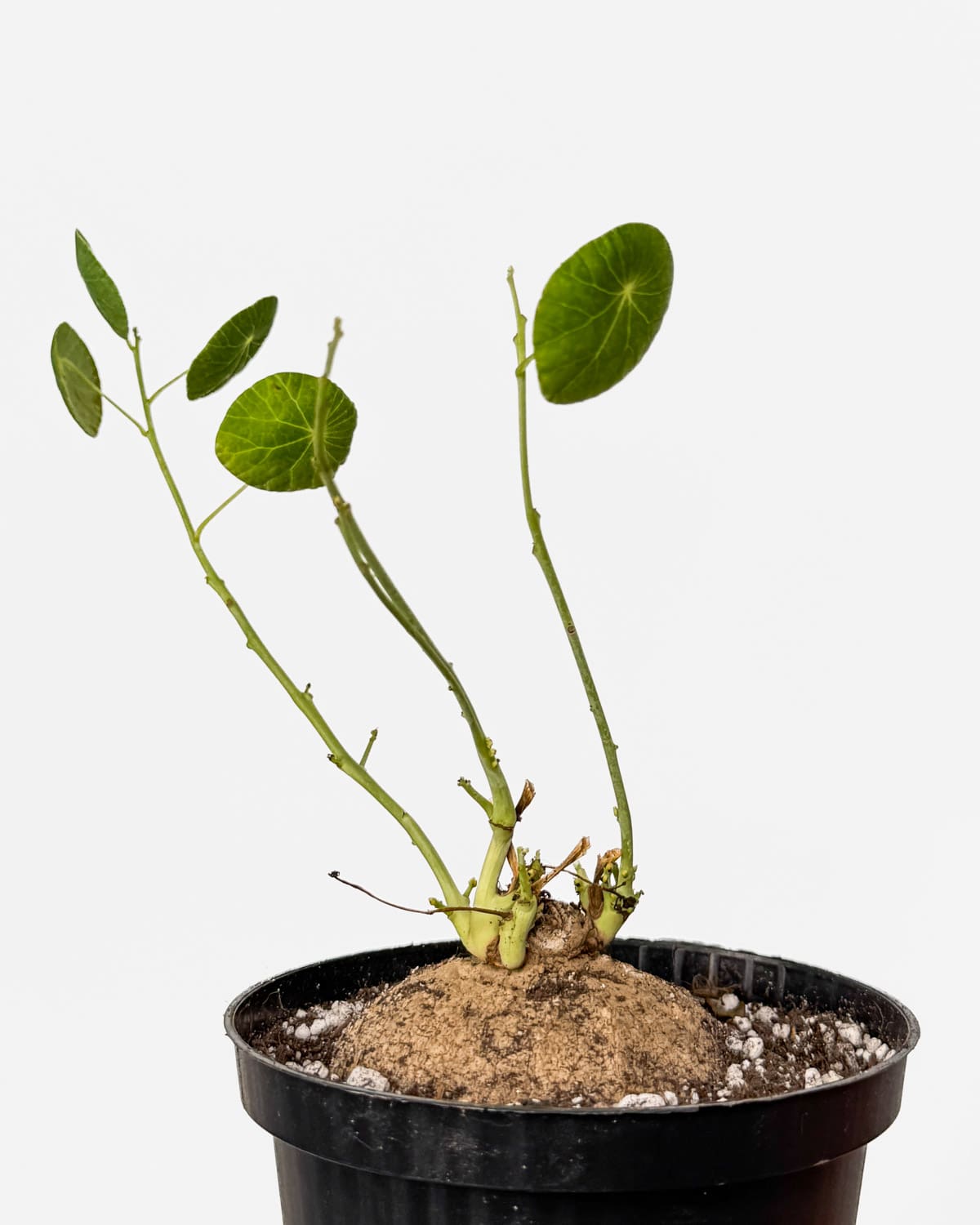 Ja sam Stephania erecta (Stephania pierrei), vrlo posebna i zanimljiva biljka s jakim deblom i nježnim okruglim listovima. Moje “krumpirasto” deblo mi omogućuje skladištenje vode i stoga sam iznimno otporna na sušu! Mogu narasti do 30 cm u visinu, ali svoj najveći potencijal ću doseći za nekoliko godina, jer rastem vrlo sporo.
