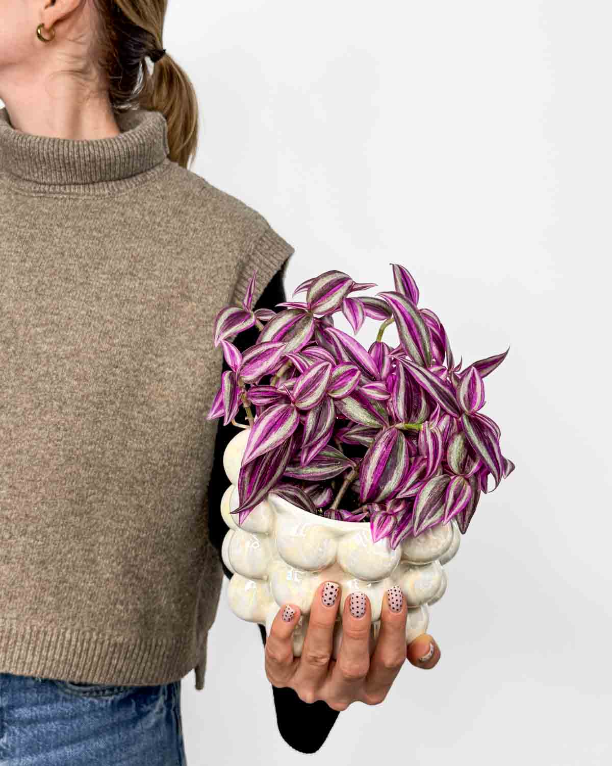 Tražiš biljku koja je jednostavna za održavanje, brzo raste i lako se razmnožava? To sam ja, Tradeskancija ‘Pink Paradise’ (Tradescantia zebrina)! Ja sam sorta koja će te oduševiti prekrasnim listovima koji se prelijevaju u zelenu, srebrnu, živopisno ružičastu i tamno ljubičastu boju. Ako želiš da zadržim bujan oblik, povremeno oreži vrhove koje možeš lako ukorijeniti u vodi ili zemlji.