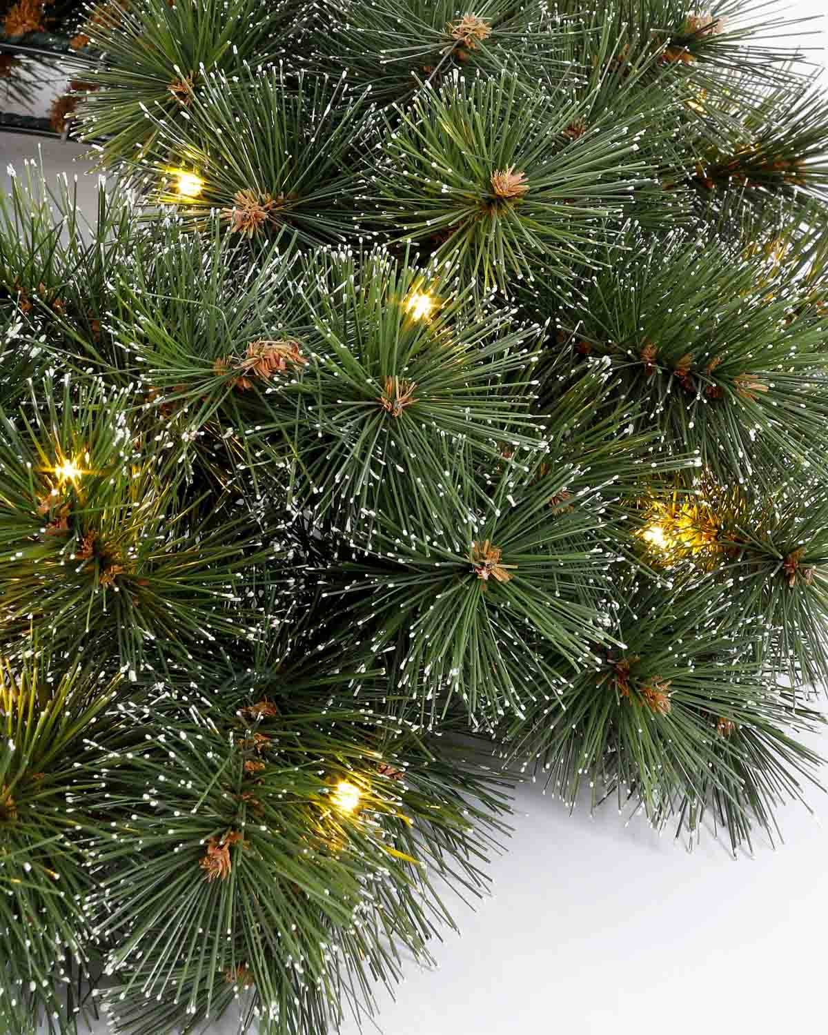 Vijenac je izrađen od kvalitetne mješavine mekih i tvrdih PVC iglica (debljina 0,38 mm), koje osiguravaju realističan izgled gustog zelenila. Ugrađeno ima 72 grančice koje stvaraju bogatu strukturu, i LED lampice u toploj bijeloj nijansi, koje stvaraju ugodnu, nježnu svjetlost. Napaja se s dvije AA baterije (nisu priložene), pa ga možeš postaviti bilo gdje, bez potrebe za utičnicom.