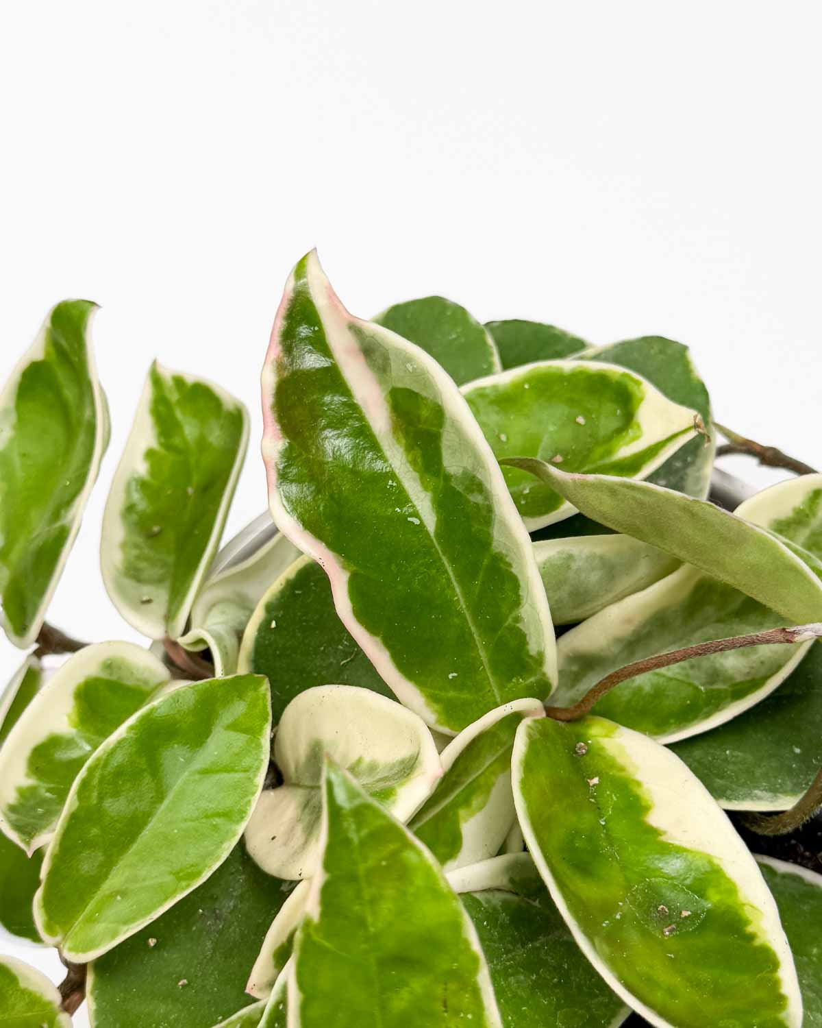 Kao i moje srodnice iz obitelji Hoya carnosa, i ja imam karakteristične voskaste i kompaktne listove, ali moje možeš prepoznati po kombinaciji zelene i bijele odnosno nježno bež boje na rubovima listova. Zbog svog oblika vrlo sam zahvalna biljka i za viseću posudu. U rano proljeće cvjetam sa zvjezdastim cvjetovima nježno ružičaste boje, koji istovremeno imaju vrlo ugodan miris. 🙂