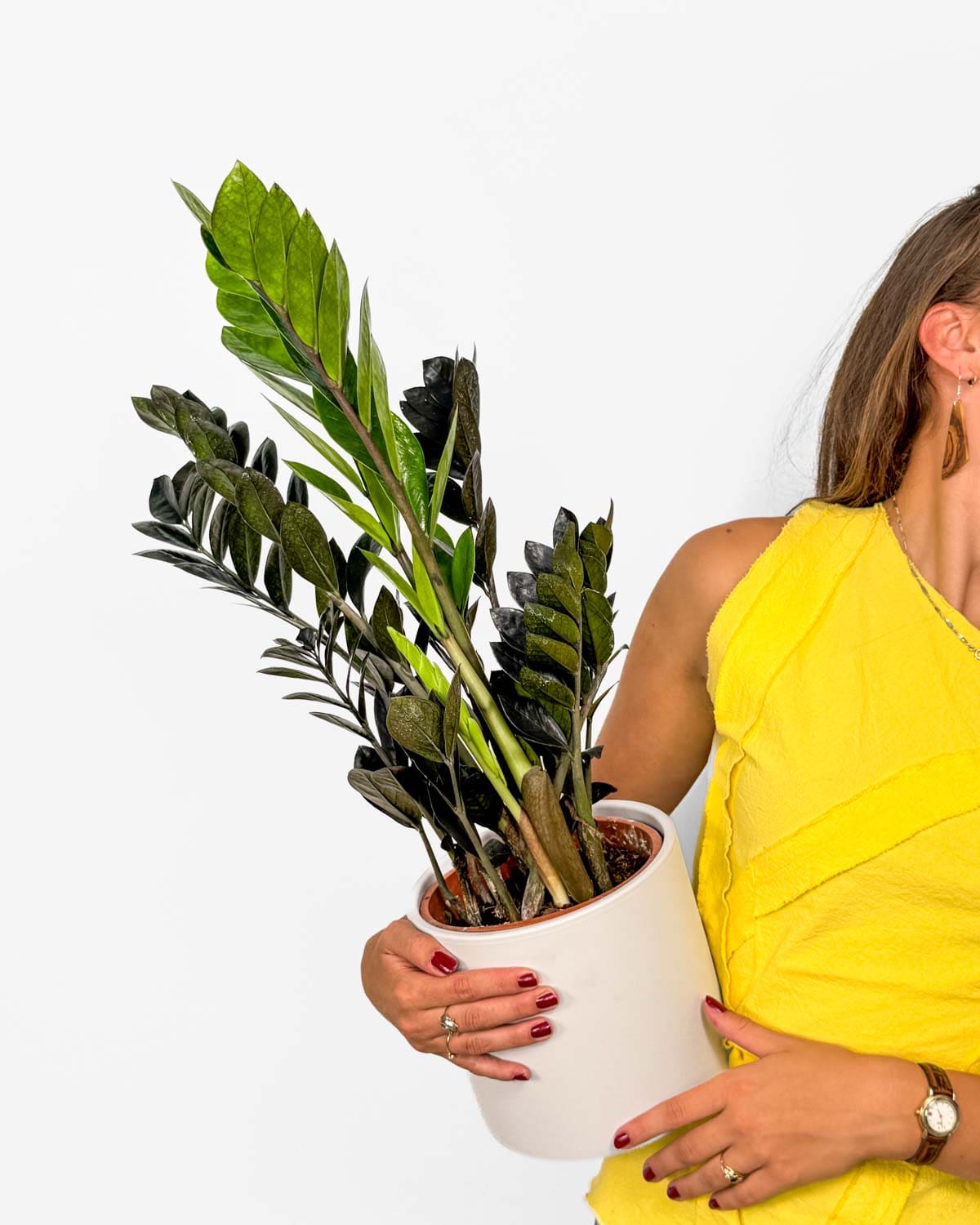 Ja svestrana i nezahtjevna Zamija (Zamioculcas zamiifolia) s mesnatim i sjajnim lišćem. U varijanti Raven, s vremenom, moje lišće postaje tamno crne boje. Zaista neobično! Prikladna sam za sunčane kutke kao i za one s vrlo malo svjetla. Budući da ne zahtijevam puno vode, mogu biti dosta vremena sama kod kuće, tako da bez brige možeš otići na odmor.
