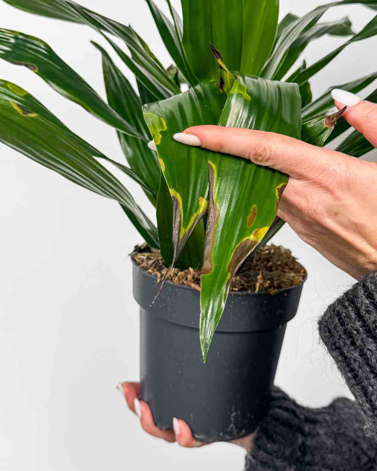 3. Mrlje na listovima: ako primjetiš suhe smeđe mrlje, vjerojatno me je opeklo sunce. Molim te, premjesti me na mjesto s manje izravne svjetlosti.