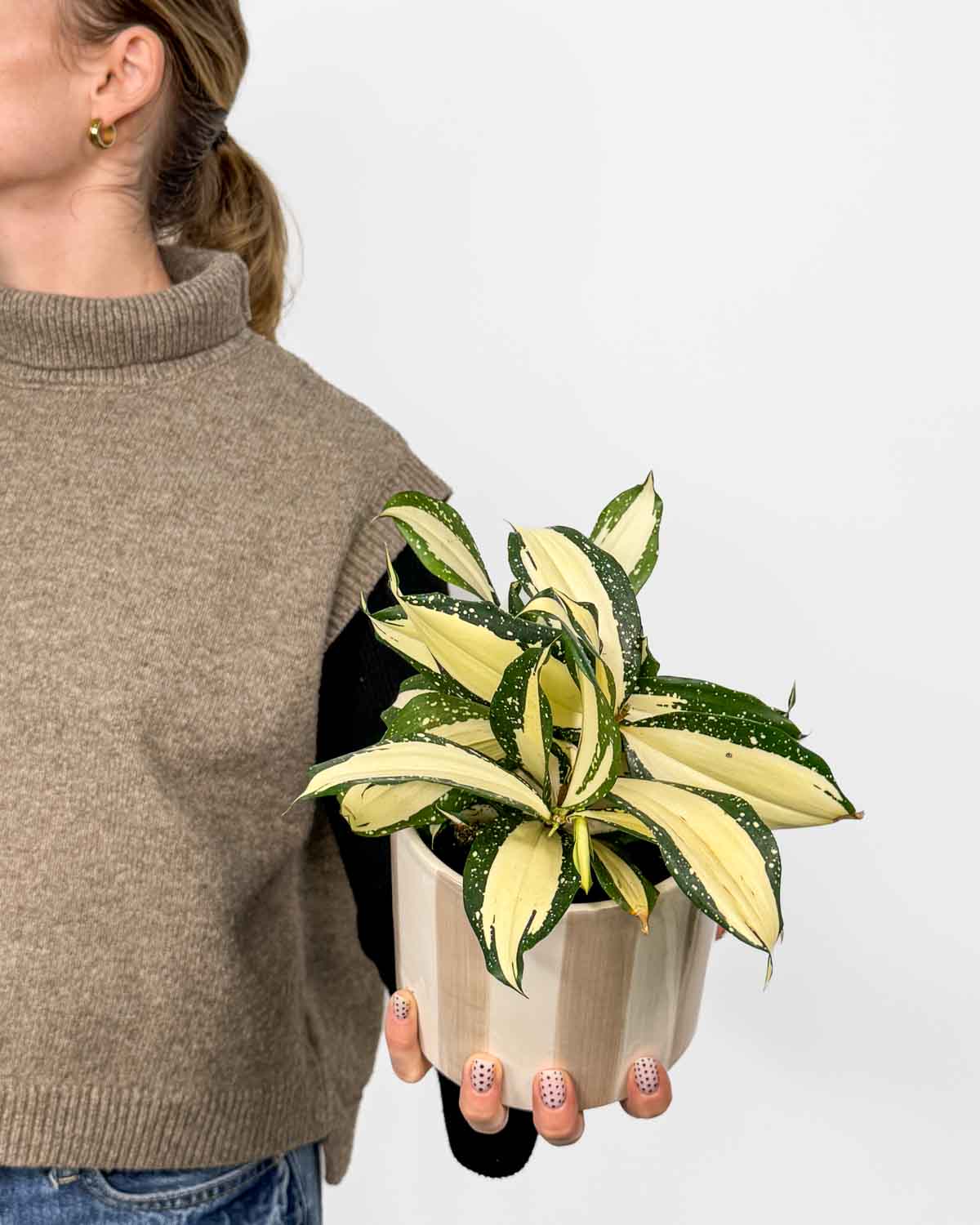 Ja sam Zmajevac ‘Milky Way‘ (Dracaena surculosa), posebna sobna biljka s nježnim, svijetlo zelenim listovima, posutim sitnim bijelim točkicama koje podsjećaju na zvijezde Mliječne staze – otuda i moje ime. Mogu rasti blago povijeno, stoga sam savršen izbor za police ili viseće lonce. Mogu narasti do 80 cm u visinu i 60 cm u širinu, a ako me želiš zadržati malom i kompaktnom, samo me redovito šišaj ;).